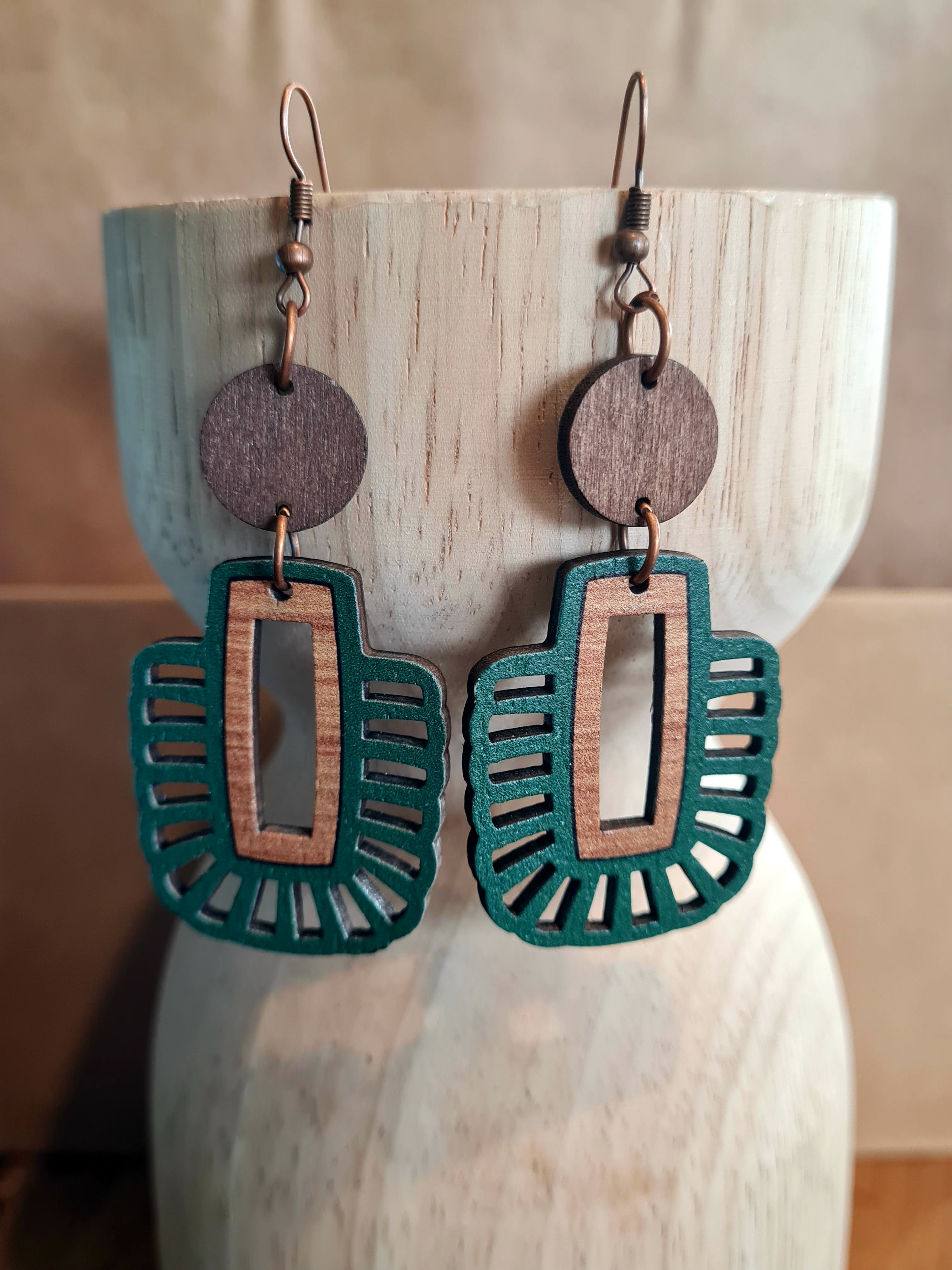 Inspired by the soft glow of lantern light, these wooden earrings feature an intricate openwork design in a warm mix of natural wood tones and deep, earthy green. The geometric cut creates a lightweight yet bold silhouette, offering both elegance and movement. Perfect for adding a touch of boho charm and nature-inspired style to your look.