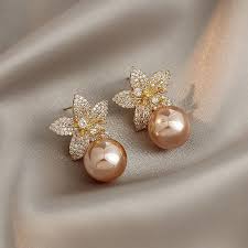 Exquisite Crystal & Gold Flower Studs with Champagne Pearl Drop
