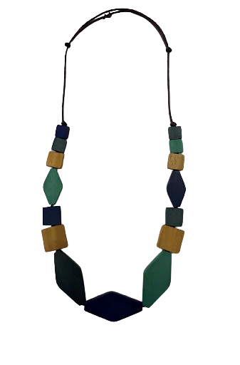 This piece has a combination of diamond and square flat wooden pieces in tones of Blue, Turquoise and a light wood shade