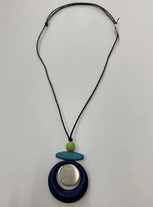 This one has Navy, Teal and a green bead with a painted silver disc in center